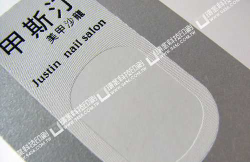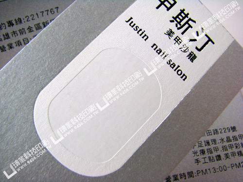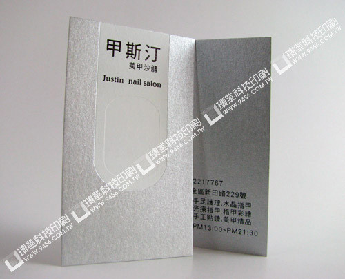 名稱:甲斯汀美甲沙龍紙材:290磅銀色星幻紙(非合版印刷紙材 )尺寸:92x 56mm加工:燙銀+燙白箔+燙黑箔加工直/橫式:直式單/雙面:雙面